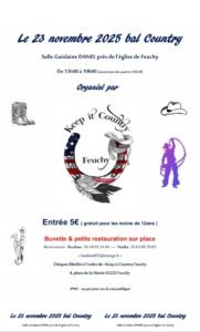 Le Dimanche 23 Novembre 2025, Après Midi Bal Country chez *Keep it Country *, de 13h00 à 19h00 Salle Guislaine Danel, près de l’église , à Feuchy (62) Pas de Calais.