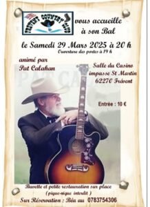 Le Samedi 29 Mars 2025, Bal Country de *Frevent Country Club*, avec Concert de *Pat Calahan*, à 20h00, Salle du Casino, Impasse St Martin, à Frévent (62270), Pas de Calais.
