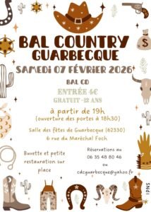 Le Samedi 07 Février 2026, Bal Country cd à partir de 19h00, Salle des Fêtes, 6rue du Maréchal Foch, à Guarbecque (62330), Pas de Calais.