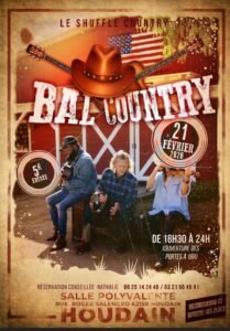 Le Samedi 21 Février 2026, Bal Country des *Shuffle Country*, de 18h30 à 24h00, Salle Polyvalente, rue Roger Salengro, à Houdain (62150), Pas de Calais.