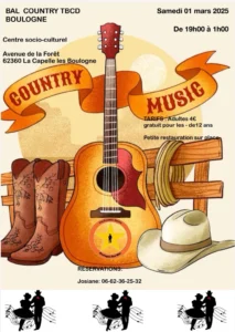 Le Samedi 1er Mars 2025, Bal Country de 19h00 à 01h00, Centre Socio Culturel, Avenue de la Foret, à La Capelle les Boulogne (62360), Pas de Calais.