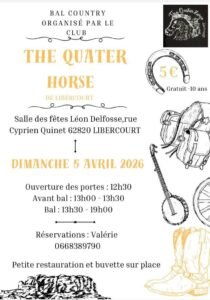 Le Dimanche 05 Avril 2026, Après Midi Bal Country des *The Quater Horse*, de 13h30 à 19h00, Salle des Fêtes Léon Delfosse, rue Cyprien Quinet, à Libercourt (62820), Pas de Calais.