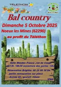 Le Dimanche 05 Octobre 2025, Après Midi Bal Country au profit du Téléthon, de 13h00 à 18h30, Salle Mendès France, ruedu Congo, à Noeux les Mines (62290), Pas de Calais.