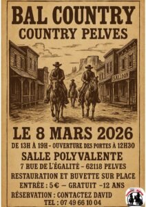 Le Dimanche 08 Mars 2026, Après Midi Bal Country des *Country Pelves*, de 13h00 à 19h00, 7 rue de L’égalité, à Pelves (62118), Pas de Calais.