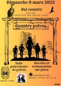 Le Dimanche 09 Mars 2025, Après Midi Bal Country chez *Country Pelves*, de 13h00 à 19h00, Salle Polyvalente de Pelves (62118), Pas de Calais.