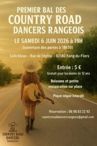 Le Samedi 06 Juin 2026, 1er Bal Country des *Country Road Dancers Rangeois*, à 19h00, Salle Bleue, rue de L’église, à Rang du Fliers (62180), Pas de Calais.