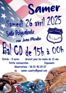 Le Samedi 26 Avril 2025, Bal Country chez *Samer Country*, de 15h00 à 00h00, Salle Polyvalente , rue Jean Moulin , à Samer (62830), Pas de Calais.