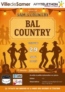 Le Samedi 29 Novembre 2025, Bal Country animé par *Sam’s Country*, à 19h00, Salle des Fêtes, Place de Labbaye, à Samer (62830), Pas de Calais.