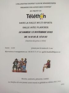Le Samedi 15 Novembre 2025, Après Midi Bal Country des *Alligator Country Club*, pour le Téléthon, de 14h00 à 18h00, Salle Multi Sports, avec Plancher, à Wardrecques (62120), Pas de Calais.