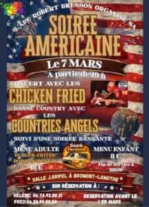 Le Samedi 07 Mars 2026, Soirée Americaine de *L’APE Robert Bresson *, à partir de 19h00, avec Concert des *Chicken Fried*, Danse Country avec *Country Angels*, et Soirée Dansante , Salle J.Gripel, à Bromont Lamothe (632