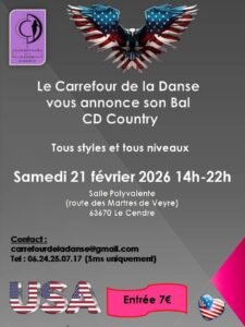 Le Samedi 21 Février 2026, Après Midi Bal Country cd de *Le Carrefour de la Danse *, de 14h00 à 22h00, Salle Polyvalente, Route des Martres de Veyre, à Le Cendre (63670), Puy-de-Dôme .