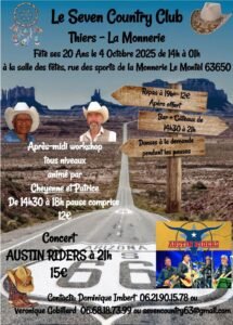 Country chez *Le Seven Country Club* qui Fetera ses 20 ans, avec Workshop par *Cheyenne et Patrice* de 14h30 à 18h00 et Bal Concert de *Austin Riders* à 21h00, Salle des Fetes , rue des Sports de la Monnerie, à Le Montel (63650), Puy de Dome.