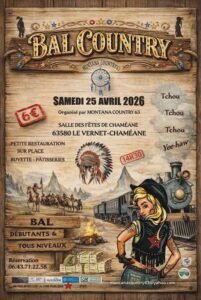 Le Samedi 25 Avril 2026, Bal Country des *Montana Country 63*, à 14h30, Salle des Fêtes de Le Vernet Chameane (63580), Puy de Dome.