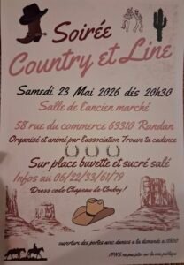 Le Samedi 23 Mai 2026, Soirée Country et Line de *Trouve ta Cadence*, dès 20h30, Salle de L’ancien Marché, 58 rue du Commerce, à Randan (63310), Puy de Dôme.