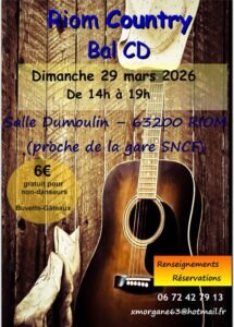 Le Dimanche 29 Mars 2026, Après Midi Bal Country chez *Riom Country*, de 14h00 à 19h00, Salle Dumoulin, à Riom (63200), Puy de Dome.