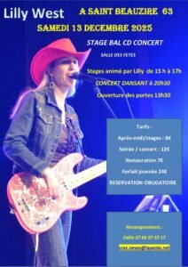 Le Samedi 13 Décembre 2025, Stage et Bal Country Concert de *Lilly West*, à partir de 15h00, Salle des fêtes de St Beauzire (63), Puy de Dome.