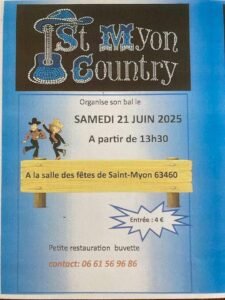 Le Samedi 21 Juin 2025, Après Midi Bal Country chez *St Myon Country*, à 13h30, Salle des Fetes de St Myon (63460), Puy de Dome.
