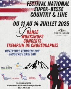 Du 11 au 14 Juillet 2025, aura lieu le Festival National Country et Line , avec Workshops, Concerts, Tremplin de Chorégraphes, du Vendredi 20h00 à Lundi 18h00, à Super Besse (63610), Pu