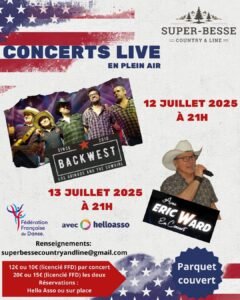 Le Dimanche 13 Juillet 2025, Soirée Country avec Concerts Live des *Backwest*, *Eric Ward*, à 21h00 en plein air , Parquet Couvert, à Super Besse (63610),