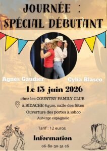 Le Samedi 13 Juin 2026, Journée Spéciale Débutants chez *Country Family Club*, à 10h00, avec *Agnès Gaudier et Cylia Blasco*, Salle des Fêtes de Bidache (64520), Pyrénées Atlantiques.