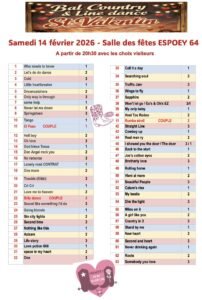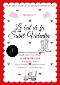 Le Samedi 14 Février 2026, Bal Country de St Valentin des *Rebel’s Country Dancers*, à 20h30, Salle des Fêtes de Espoey (64420), Pyrénées Atlantiques.