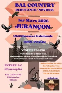 Le Dimanche 1er Mars 2026, Bal Country (Débutants Novices), à 14h00, Salle Atelier du néez, Avenue du 18 Juin , à Jurançon (64110), Pyrénées Atlantiques .