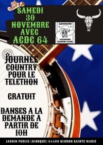 Le Samedi 30 Novembre 2024, Journée Country à partir de 10h00, chez *Aquitaine Country Dance Club*, au profit du Téléthon, Jardin Public Kiosque, à Oloron Ste Marie (64400)