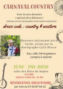 Le Vendredi 27 Février 2026, Soirée Country Western Carnaval , animée par *Cylia Blasco*, avec Initiations Ultra Faciles, de 19h00 à 21h30, Salle des Fêtes de Sames (64520), Pyrénées A