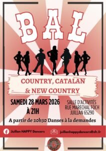Le Samedi 28 Mars 2026, Bal Country , Catalan et New Country des *Juillan Happy Dancers* , à 21h00, Salle D’activitésrue du Marechal Foch, à Juillan (65290), Hautes Pyrénées.
