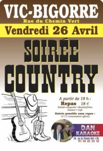 Le Vendredi 26 Avril 2024, Soirée Country à 19h00, rue du Chemin Vert, à Vic en Bigorre (65500), Hautes Pyrénées.