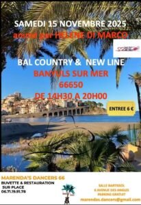 Le Samedi 15 Novembre 2025, Après Midi Bal Country et New Line animée par *Helene Di Marco*, de 14h30 à 20h00, chez les *Marenda’s Dancers 66*, Salle Bartissol, 6 Avenue des Angles, à Banyuls
