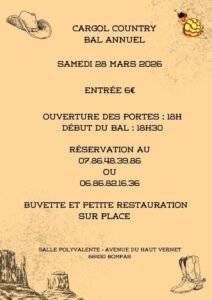 Le Samedi 28 Mars 2026, Bal Country annuel des *Cargol Country*, à 18h30, Salle Polyvalente, Avenue du Haut Vernet, à Bompas (66430), Pyrénées Orientales.
