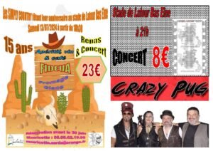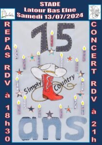 Le Samedi 13 Juillet 2024, Soirée Repas à 18h30 et Concert de *Crazy Pug*, à 21h00, avec *Simply Country*, Stade Latour Bas Elne (66200), Pyrénées Orientale