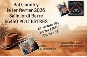 Le Dimanche 1er Février 2026, Après Midi Bal Country à partir de 13h30, Salle Jordi Barre, à Pollestres (66450), Pyrénées Orientales.