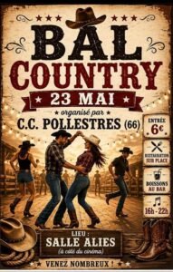 Le Samedi 23 Mai 2026, Bal Country des *CC Pollestres*, de 16h00 à 22h00, Salle Alies, à coté du cinéma, à Pollestres (66), Pyrénées Orientales.