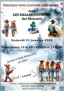 Le Samedi 31 Janvier 2026, Soirée Country Line Dance à partir de 17h00, avec *Les Dallas Country del Monestir*, Espace St Mamet, à St Esteve (66240), Pyrénées Orientales.