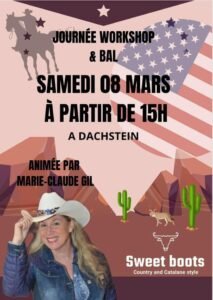 Le Samedi 08 Mars 2025, Journée Country animée par *Marie Claude Gil*, chez *Sweet Boots*, à 15h00, avec Workshop et Bal Country, à Dachstein (67), Bas Rhin.