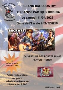 Le Samedi 11 Avril 2026, Grand Bal Country à partir de 19h30, avec Concert des *Backwest*, chez *Djeis Bodina*, Salle de L’Escale, à Entzheim (67), Bas Rhin.