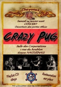 Le Samedi 24 Janvier 2026, Soirée Country à partir de 18h00, chez *Country Chayonas Club*, avec Concert des *Crazy Pug*, Salle des Corporations, 1 rue du Houblon, à Haguenau (67