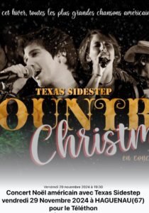Le Vendredi 29 Novembre 2024, Soirée Country Concert de Noel Americain animée par *Texas Sidestep*,au profit du Téléthon, à 19h30, à Haguenau (67), Bas Rhin.