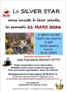 Le Samedi 21 Mars 2026, Soirée Country avec Pré Bal et Concert des *Blue Jeans* à 20h00, Salle Polyvalente de Ittenheim (67117), Bas Rhin.