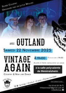 Le Samedi 22 Novembre 2025, Soirée Country des *Little Wolves*, avec *Outland* , à 19h00, Salle Polyvalente, rue de la Schifflach, Meistratsheim (67210), Bas
