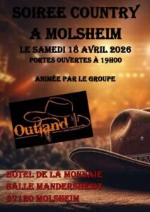 Le Samedi 18 Avril 2026, Soirée Country avec Concert des *Outland*, à 19h00, Hotel de la Monnaie, Salle Mandersheidt, à Molsheim (67120), Bas Rhin.