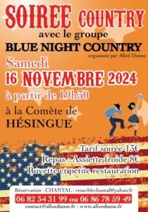 Le Samedi 16 Novembre 2024, Soirée Country à partir de 19h30, organisée par *Alizé Danse*, avec un Concert de *Blue Night Country*, à