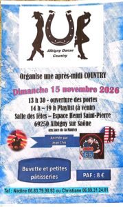 Le Dimanche 15 Novembre 2026, Après Midi Country Dance animée par *Jean Chri*, de 14h00 à 19h00, Salle des Fêtes, Espace Henri St Pierre, à Albigny sur