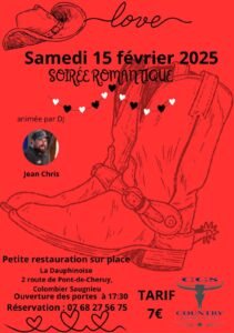 Le Samedi 15 Février 2025, Soirée Country Romantique, animée par *DJ Jean Chris*, à partir de 17h30, La Dauphinoise, 02, Route de Pont de Cheruy, à Colombier Saugnieu (
