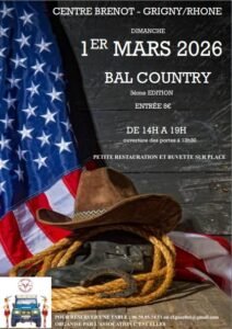 Le Dimanche 1er Mars 2026, Après Midi Bal Country de *L’ Association c’est elles*, de 14h00 à 19h00, Centre Brenot, à Grigny (69) Rhône.