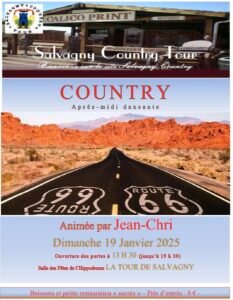 Le Dimanche 19 Janvier 2025, Après Midi Bal Country chez *Salvagny Country Tour*, animée par *Jean Chri*, de 13h30 à 19h30, Salle des Fetes de LHippodrome, La Tour de S