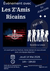 Le Jeudi 14 Mai 2026, Après Midi *Les Z’Amis Ricains*de 14h00 à 19h30, Salle de la Charpenterie, à St Bonnet de Mure (69720), Rhône.