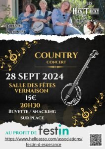 Le Samedi 28 Septembre 2024, Soirée Concert Folksong et Country des *Hen Tucky*, à 20h30, Salle des Fetes de Vernaison (69390), Rhone.